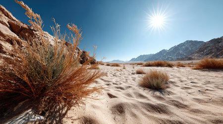 A breathtaking view of an expansive desert landscape featuring sparse vegetation, illuminated by bright sunlight and framed by distant rocky mountains.