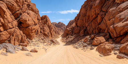 This breathtaking desert landscape showcases an inviting sandy pathway nestled between impressive rocky cliffs under a clear blue sky.