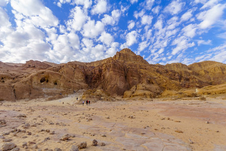 Timna, Israel - January 16, 2020: View of the Arches rock formation, with visitors. Part of the Timna Valley Park, Arava desert, southern Israel