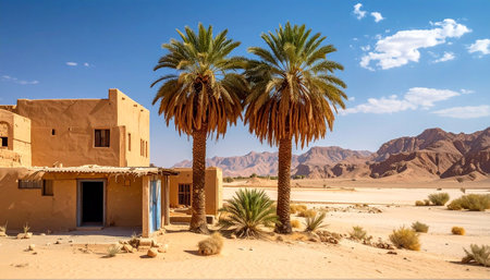 This stunning desert landscape showcases rocky mountains alongside vibrant vegetation, highlighting the contrast between arid sand and lush plant life under a bright blue sky.