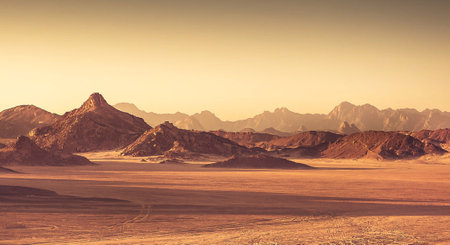 Fantastic landscape with mountains at sunset. Arabian desert, Egypt. Beautiful nature. Creative toning effect