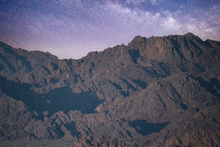 Night landscape, mountain range, rocks, stone peaks against the background of the night sky with stars and the Milky Way, Sinai.