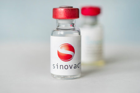 Coronavirus COVID-19 Vaccine Vials and Syringe On Reflective Surface.
