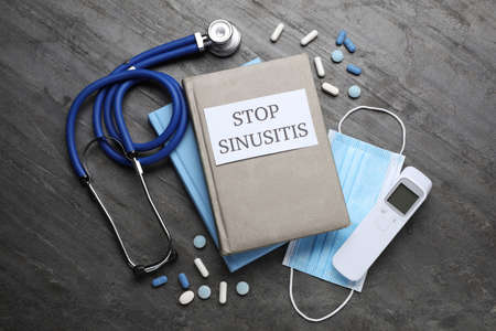 Notebook with phrase STOP SINUSITIS, stethoscope, non-contact thermometer, medical mask and different drugs on gray background, flat lay