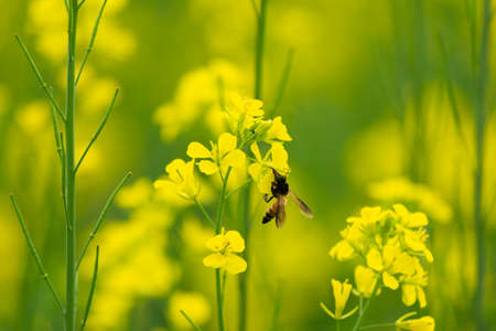 Golden lush blooming rapeseed, bees are collecting nectar