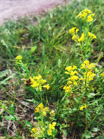 Wild turnip (Barbarea vulgaris) blooms in nature among grasses.