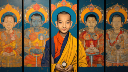 A young buddhist monk standing in front of a painting. Generative AI image.