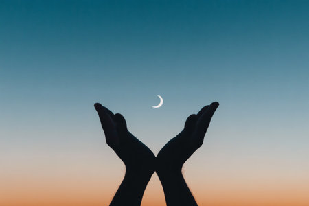 Silhouetted hands towards reach a delicate crescent moon, set against a stunning gradient sky at dusk. Warm colors blend into deep blues, showcasing a serene moment of connection.