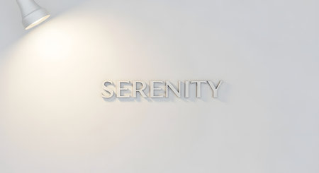 A conceptual, minimalist image of the word 'SERENITY' in 3D, elevated on a clean white wall. A bright spotlight illuminates the text, creating a clean shadow and emphasizing the concept of peace and tranquility.