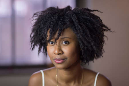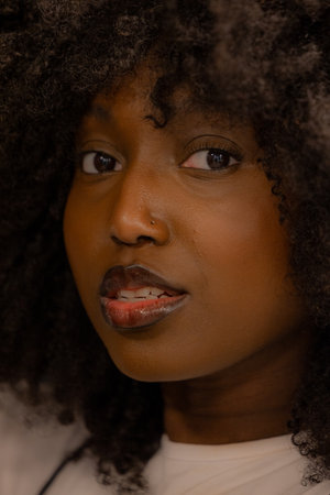 Closeup portrait of a confident woman with curly hair, gazing at the camera, showcasing her beauty and allure