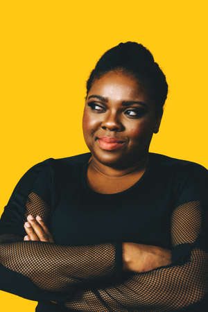 portrait of a beautiful black woman smiling with crossed arms on yellow background looking away
