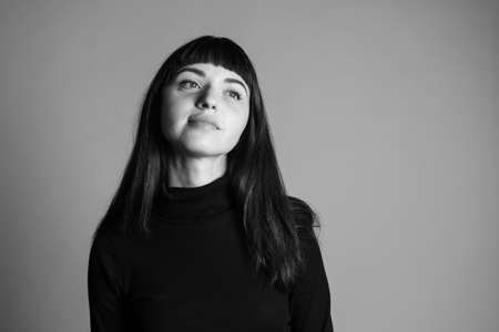 Close up studio portrait of a pretty brunette woman, wearing folded black polo-neck sweater, looking to the side, against a plain grey background