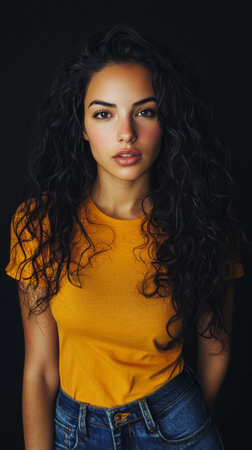 A captivating moment captures a woman with voluminous curly hair wearing a bright yellow shirt, showing her natural beauty and confident expression against a contrasting dark background.