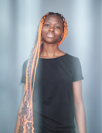 A young woman with long braided hair gazes confidently at the camera in a brightly lit blue room. The light highlights her features and expression, creating an engaging atmosphere.