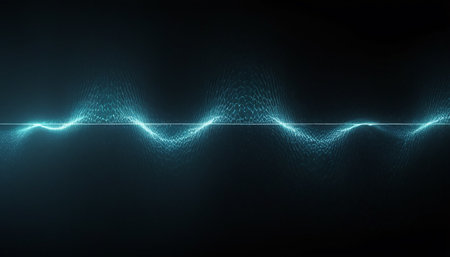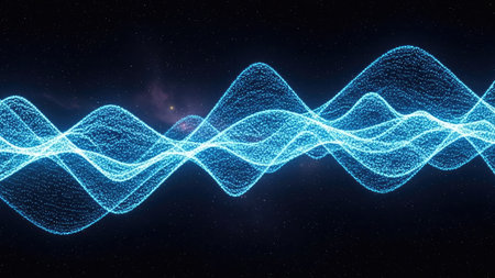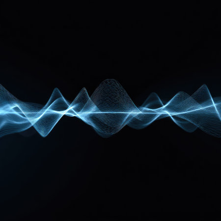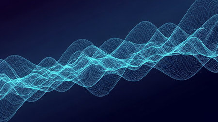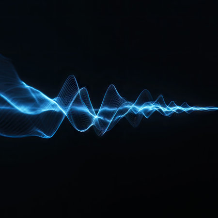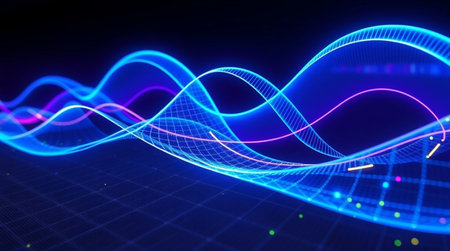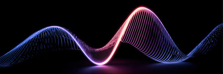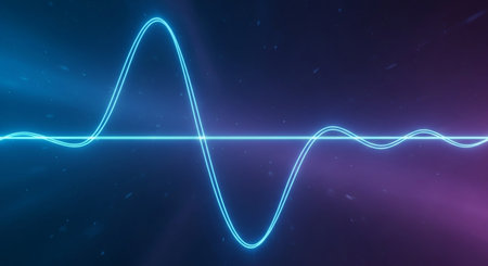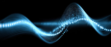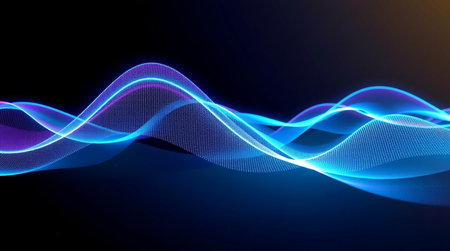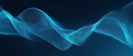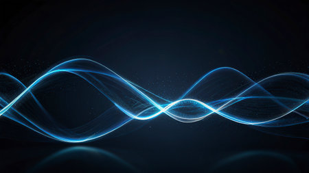 An illustration features a glowing blue waveform against a dark backdrop. The visual characteristics include vibrant blue light, suggesting an energy field or data representation. The style is abstract and conceptual. It's suitable for various applications, including tech-related presentations, design projects, and educational materials.