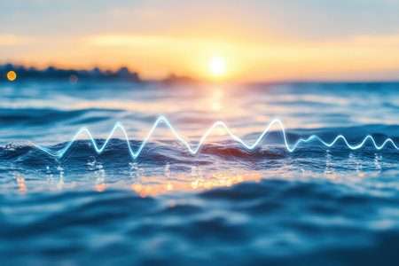 Waves crest and fall in a rhythmic pattern resembling a heartbeat line as the sun sets over the horizon, blending water and life in harmony.