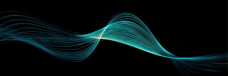 An abstract illustration presents a luminous blue waveform against a dark backdrop. The composition features smooth, curved lines with a subtle glow, evoking a sense of motion and energy. This design may be suitable for technology presentations, data visualization, or graphic design projects, providing a visual element.