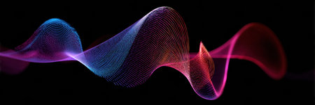 An abstract digital illustration presents a flowing waveform design. The image features a gradient of pink and blue hues against a black backdrop. The composition suggests motion and energy, suitable for visual representations related to data, sound, or communication. This image may be used for various design projects.