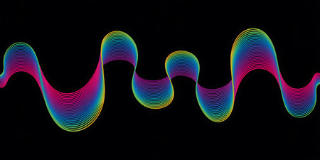 An image displays a vivid digital sound wave represented by flowing, colorful curves. The composition features a dark background with blurred lights and a focus on the central wave. The curves display a spectrum of colors, suggesting technology or auditory concepts. Suitable for various media related to music, technology, and design.