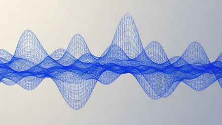 An abstract visualization features a blue waveform pattern against a gradient background. The composition uses intersecting lines, creating a volumetric effect. The image's clean aesthetic and design suggest applications in data representation, audio, and visual design. It could be used for various commercial or editorial uses.