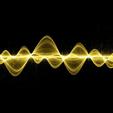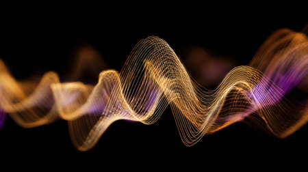 Close-up abstract audio waveform graphic with light trails in gold and violet tones on black.