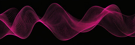 This vibrant abstract digital waveform features glowing cyan and magenta lines on a dark background. It represents sound and music concepts, ideal for technology projects.
