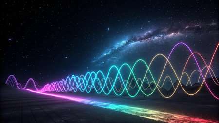 Vibrant waveforms showcase sound frequencies in colorful patterns against a dark backdrop, creating a captivating visual effect.
