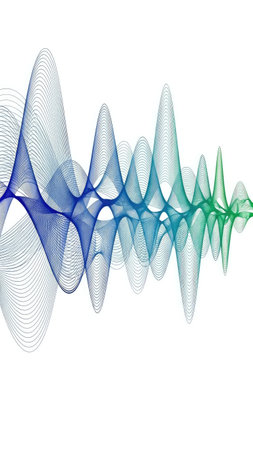 This image features abstract sound wave patterns rendered in shades of blue and green. The composition highlights flowing lines against a stark white background. It showcases a modern, graphic style, likely suitable for digital media, presentations, and design projects. These visuals could be useful for commercial and editorial applications.