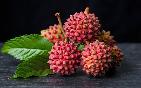A detailed shot of a unique plant featuring numerous tiny, reflective golden spheres clustered together, creating a striking visual against the deep, dark backdrop.