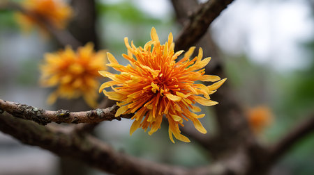 A vibrant flower showcases its intricate, colorful structure with numerous delicate petals and stamen. Soft, diffused light highlights the beauty of nature in a serene environment.