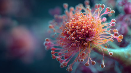 A close-up of a colorful cellular structure featuring fine filaments and textures. This detailed representation highlights the complexity of microscopic life forms in a scientific setting.
