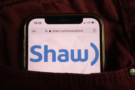 KONSKIE, POLAND - August 17, 2021: Shaw Communications Inc logo displayed on mobile phone hidden in jeans pocket