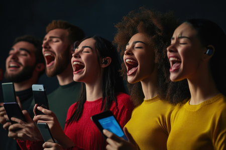 A group of five friends sing passionately while holding their smartphones, united in a joyful experience.