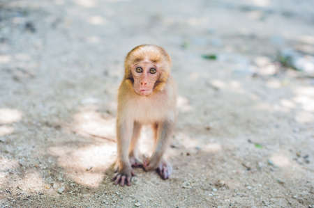 Monkey sits on a ground, looks at you. Koh Pangan, Thailand.