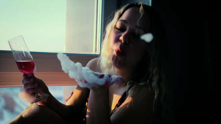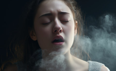 A woman is blowing smoke into her mouth, AI