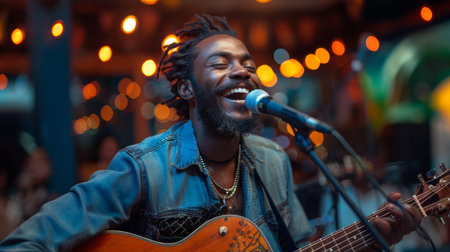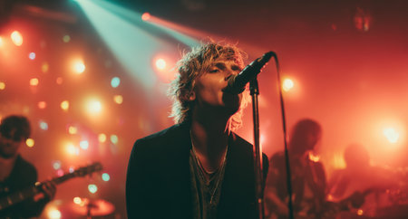 Male singer performing on stage with vibrant lights and fellow musicians, capturing the excitement of a live concert, showcasing talent and energy