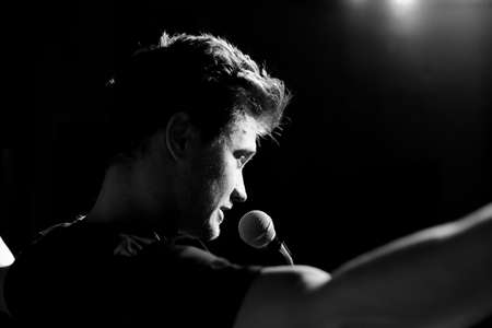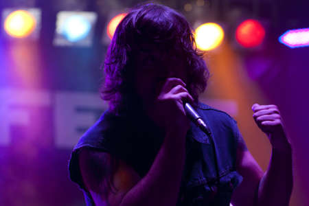 ARKHANGELSK, RUSSIA - APRIL 14, 2014: Silhouette of rock singer live on stage.
