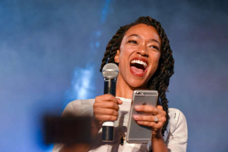 Johannesburg, South Africa - April 28, 2015: Gabriela, Mozambique singer recording vocal part on Afro-pop song in studio