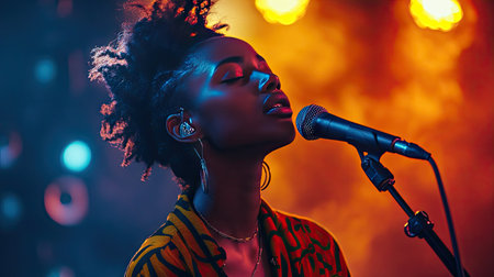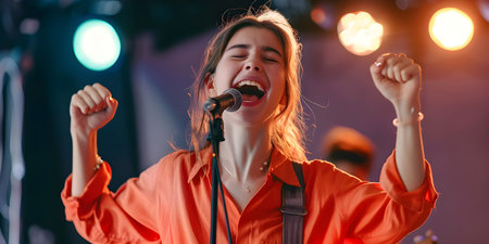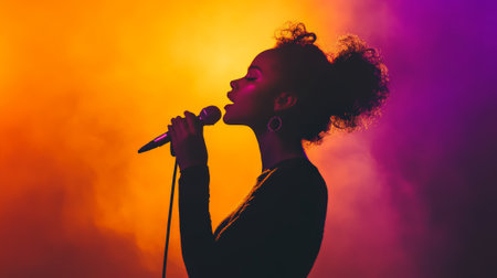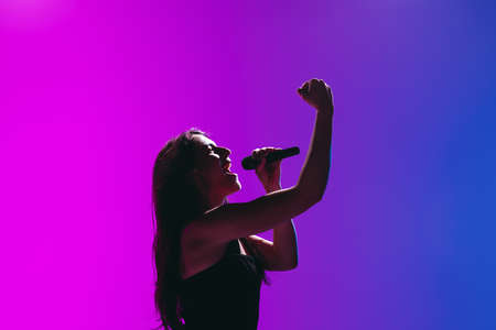 Silhouette of young female singer passionately performing live on stage with colorful lights and microphone, creating a vibrant and energetic atmosphere