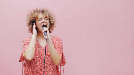 Cute girl singing loudly with a microphone in her hand. Hand on her ear. Singer enthusiastically with a microphone. Dressed in pink top. Isolated over pink background.