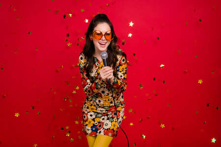 Portrait of attractive cheerful trendy girl singing hit single celebrating old school isolated over bright red color background