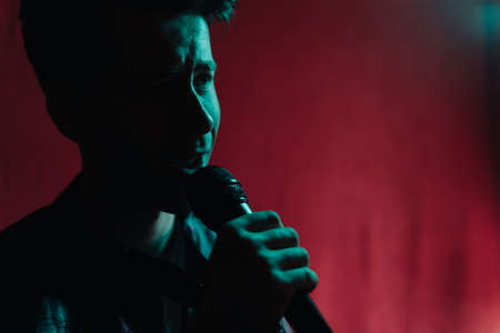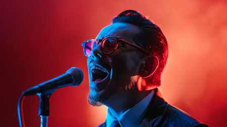 Close up portrait Rock band vocalist singing to microphone in lights on red background