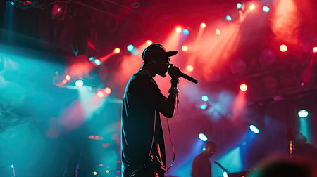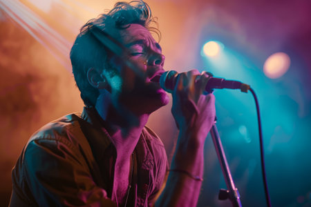 Young male singer passionately performing live on a vibrant stage, illuminated by colorful spotlights and filled with atmospheric smoke, creating a captivating concert experience