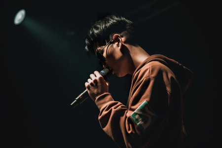 Asian rapper, singer on stage reading rap, dynamic pose, hero angle, AI generative illustration