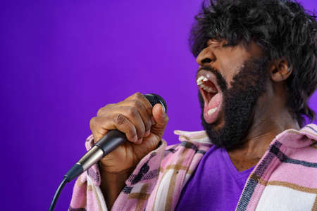 Caraoke or Dj music song. Man with enthusiastic face holds microphone, singing song, black background.