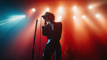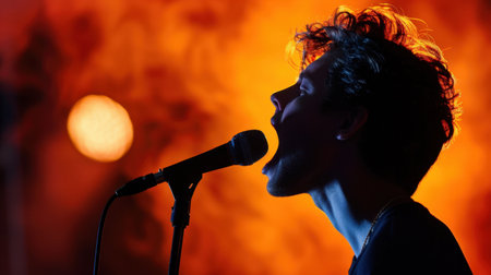 Captivating silhouette of a passionate singer belting out a powerful note, set against vibrant stage lights that enhance the electric atmosphere.