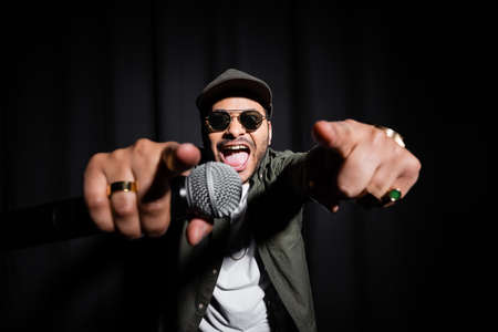 excited middle east hip hop performer in sunglasses and cap singing in microphone and gesturing on black