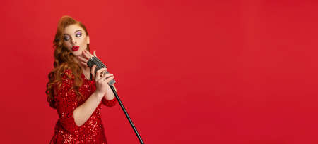 Cropped portrait of enthusiastic female jazz singer on stage isolated over red background. Flyer