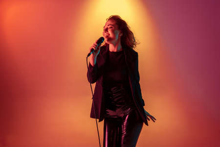Caucasian female singer portrait isolated on gradient studio background in neon light. Beautiful female model in pink wear with microphone. Concept of human emotions, facial expression, ad, music, art.
