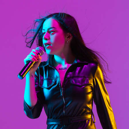 female singer in neon light. Girl in white shirt with microphone. Concept of art, human emotions.